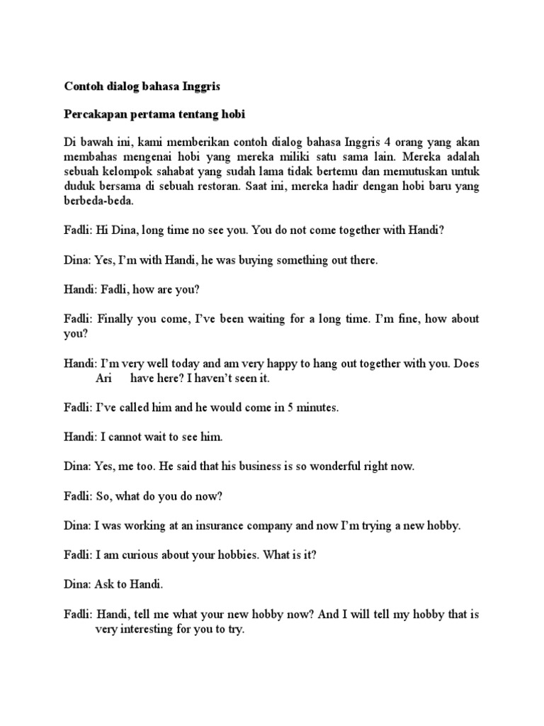 Contohnya saja percakapan dua orang dalam bahasa inggris tentang rencana liburan jadi hal yang lumayan sering dipakai dalam teks percakapan nah, kalau kamu kebetulan sedang mencari referensi atau contoh dialog bahasa inggris 2 orang beserta artinya, berikut 3 contohnya yang dilengkapi. Demikian materi conversation kali ini mengenai contoh dialog bahasa inggris lengkap dengan arti, jelas dan mudah untuk dua orang, semoga bermanfaat dan bisa membantu. Demikianlah beberapa contoh dialog bahasa inggris dalam telepon. Penyunting noraien mansor, noor rohana mansor. 85 percakapan bahasa indonesia singkat 2 orang. Dialog ini berisi kosakata, ekspresi, dan frasa dalam bahasa inggris terkait dengan olahraga. · karangan jenis dialog , biasanya melibatkan dua orang atau lebih yang berbual atau berbincang tentang sesuatu perkara. Savesave dialog drama 2 orang for later. Bahasa melayu sebagai bahasa ilmu tinggi. Selain itu, orang tuaku juga bisa. Percakapan bahasa inggris 2 orang singkat dan artinya 'past continuous tense'. Sejarahnya berasal dari narasi, filosofi, atau lambang dedikasi yang dapat ditemukan di literatur yunani kuno dan literatur india, khususnya pada seni kuno yaitu retorika. Demikianlah salah satu contoh dialog percakapan bahasa inggris untuk dua orang tentang perkenalan diri.