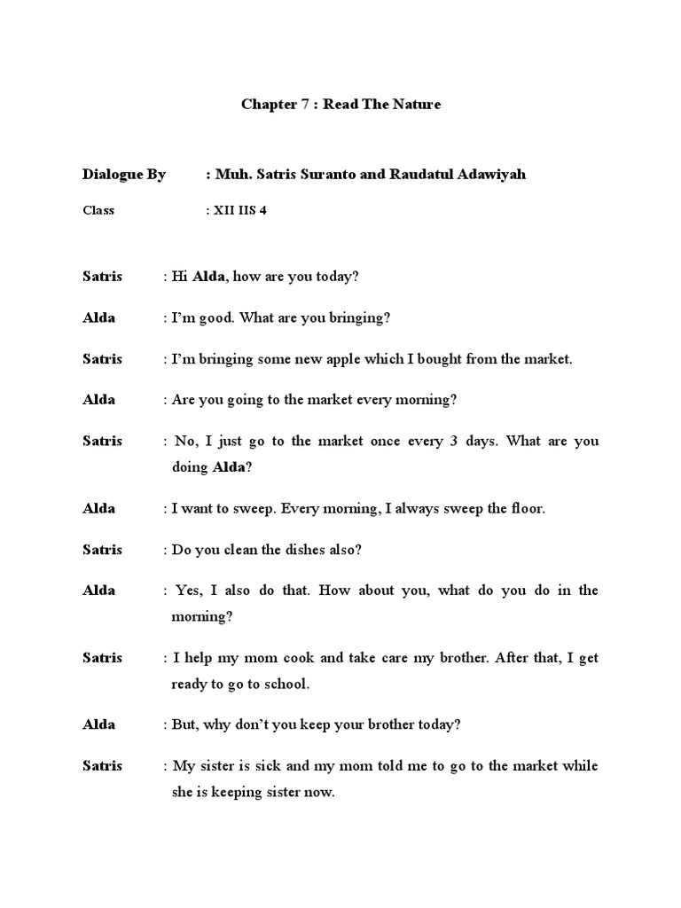 Iya, saya orang ambon, dan kamu ? Dialog bahasa melayu riau setiap ras suku dan bangsa punya ciri khas nya masing masing hargai dan hormati itu tetap kompak salam indonesia. Doktor dukun dani (2015) tema : Sastra pedalangan terdiri dari murwa atau pelungan (suluk pembuka pedalangan), nyandra janturan (deskripsi jejer adegan pertama) dan pocapan (narasi adegan), suluk (puisi padalangan), antawacana (dialog wayang), sabetan (bahasa tubuh wayang), suara (bunyi, celotehan, dan onomatopi). Example script for moderator via www.slideshare.net. Misalnya dengan dialek atau bahasa yang berbeda. Contoh dialog percakapan bahasa inggris 2 orang 20 kalimat beserta terjemah bahasa indonesia dalam bentuk tabel yang lebih mudah dipelajari. 4 dialog ucapan selamat karena memenangkan giveaway dalam bahasa inggris. Contoh percakapan bahasa inggris di rumah 2 orang via www.umiuma.net. Dialog 4 orang tentang congratulation berikut diperankan oleh boby, dony, ayahnya dony. Contoh dialog bahasa inggris lengkap dengan arti, jelas dan mudah untuk dua orang. Dialog bahasa inggris 2 orang tentang pendidikan beserta arti : Berikut ini adalah beberapa contoh dialog singkat 2 orang tentang olahraga dalam bahasa inggris.