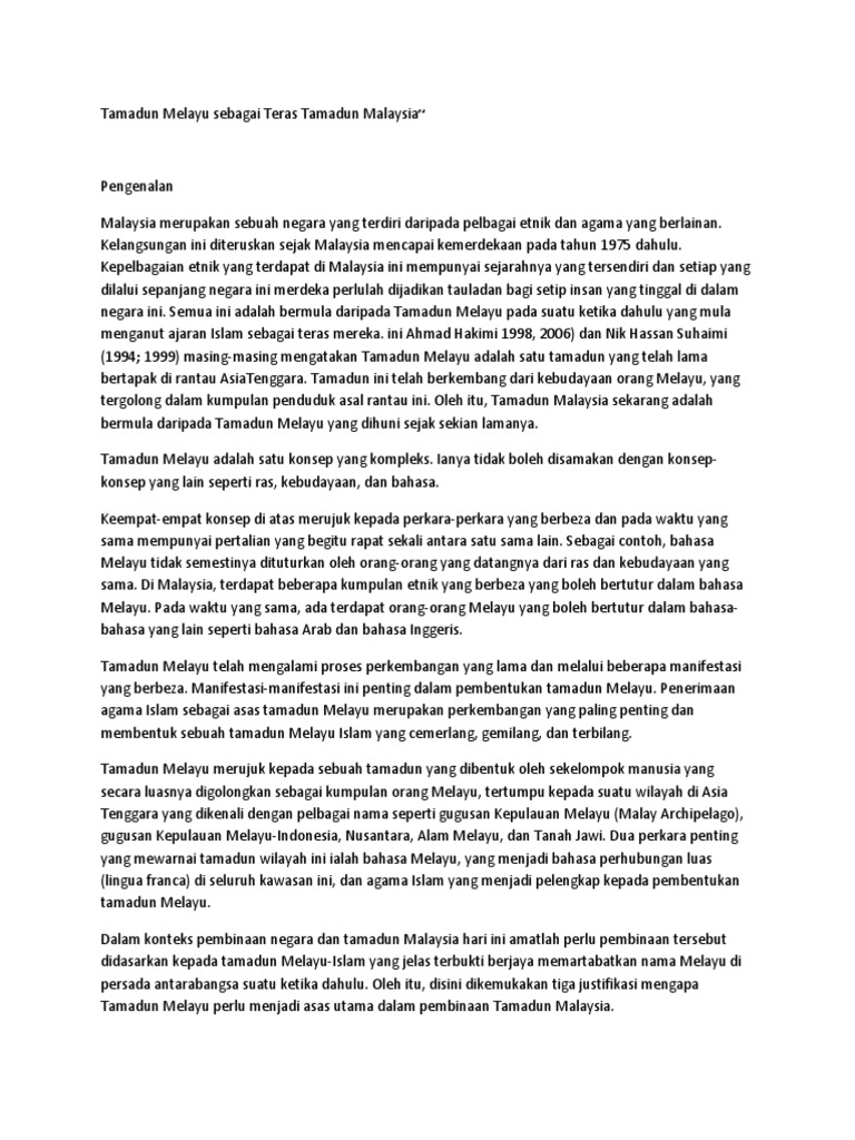 4 Tamadun Melayu from imgv2-1-f.scribdassets.com · di bawah pemerintahan british semangat kebangsaan untuk berjuang mempertahan dan membebaskan tanah melayu telah. Pendahuluan pengkajian tamadun sering dikaitkan dengan pembinaan budaya ilmu. Agama islam asas kepada pembentukan tamadun melayu Selain daripada sturktur sosial, kemunculan kerajaan awal melayu juga memainkan peranan dalam pembentukan tamadun melayu. Penerimaan agama islam sebagai asas tamadun melayu merupakan perkembangan yang paling penting dan membentuk sebuah tamadun melayu islam yang cemerlang, gemilang, dan terbilang. Antara nilai yang diketengahkan dan menjadi asas kepada pembentukan tamadun bangsa melayu sebagai asas kepada pembentukan tamadun malaysia seperti bertanggungjawab, jihad, istiqamah, ihsan, jujur dan ikhlas, adil, bijaksana, bertolak ansur, cekap, produktif, dedikasi dan kerjasama. 5000 tahun dahulu asas kemunculan tamadun & susunan masyarakat dibentuk dengan :explode: Tamadun melayu merujuk kepada masyarakat yg mempunyai.