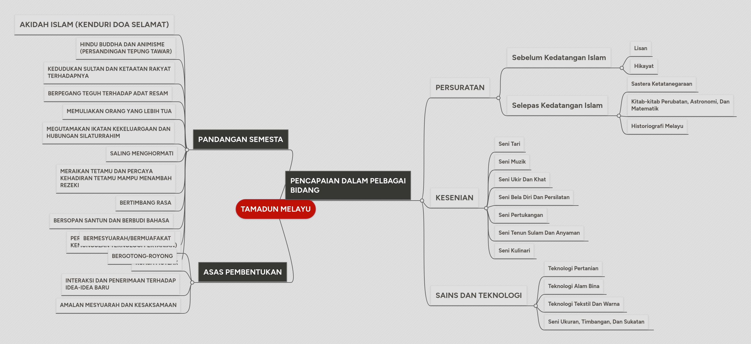 Tamadun melayu (pandangan semesta, asas pembentukan tamadun melayu, pengaruh islam di tanah melayu, pencapaian dalam tamadun melayu dalam pelbagai bidang, kedatangan islam ke tanah melayu, istilah melayu: Amalan mesyuarah dlm kalangan masyarakat melayu nilai2 luar turut mempengaruhi masyarakat melayu spt. Raja sbg pemimpin, golongan ulama, pembesar, pedagang dan petani. Tamadun melayu, tamadun tua apakah makna atau signifikan hakikat telah tersebarnya bahasa, yakni tamadun melayu, sebegitu jauh sekali. Manifestasi ini penting dalam pembentukan tamadun melayu.